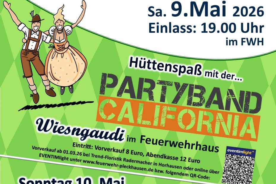 8te Mai Party mit der „Partyband California„ in Pleckhausen! Am 09. Mai 2026 startet die achte Mai Party im Feuerwehrhaus Pleckhausen und lädt wieder zu einer unvergesslichen… Mehr lesen »8te Mai Party in Pleckhausen!
